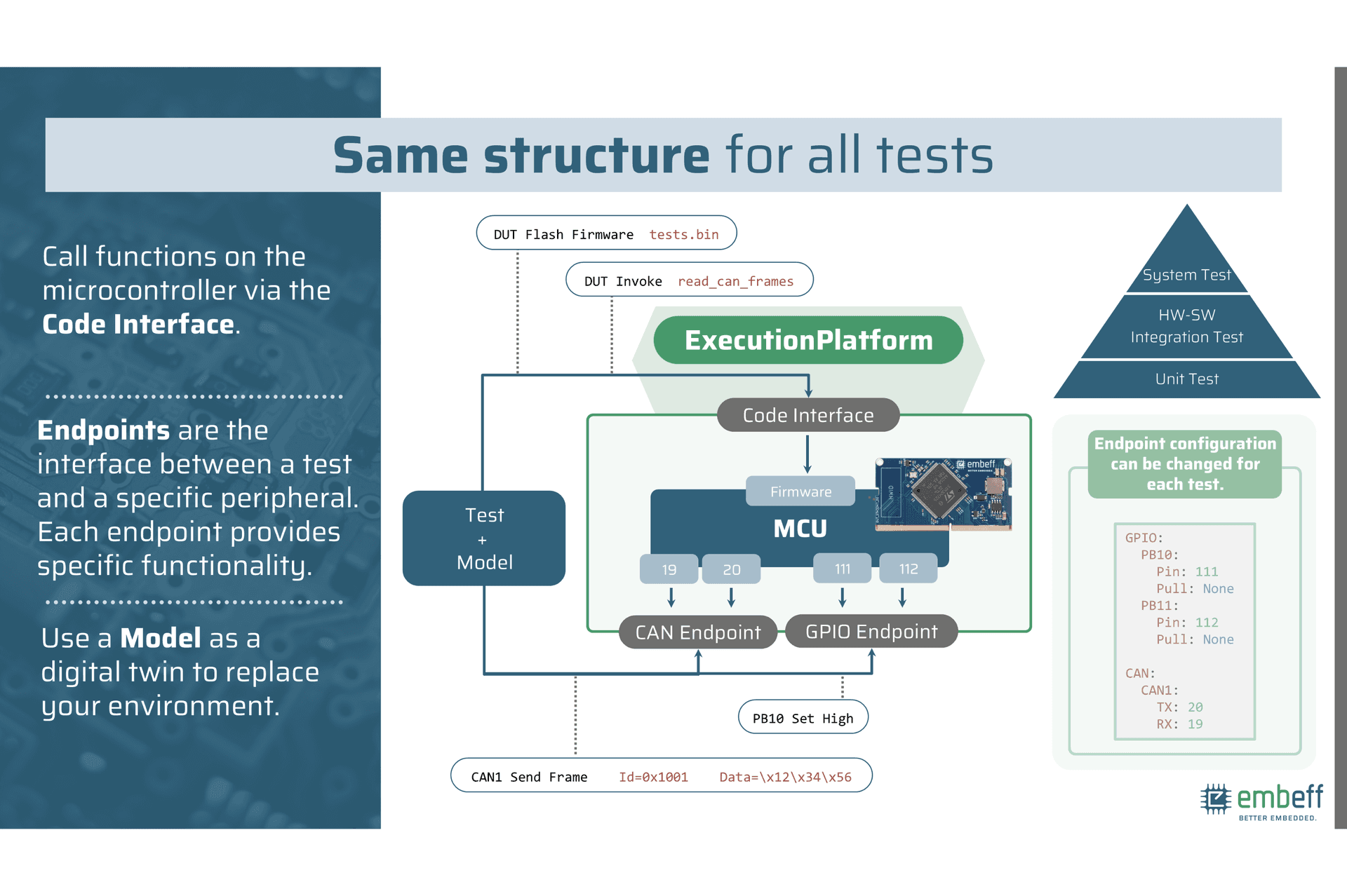 Testing microcontroller code is a time-consuming and manual process. Teams typically rely on lab equipment and HiL (Hardware-in-the-Loop) test benches connected to on custom PCBs. Often, automated testing is only performed with the final hardware by a verification department.