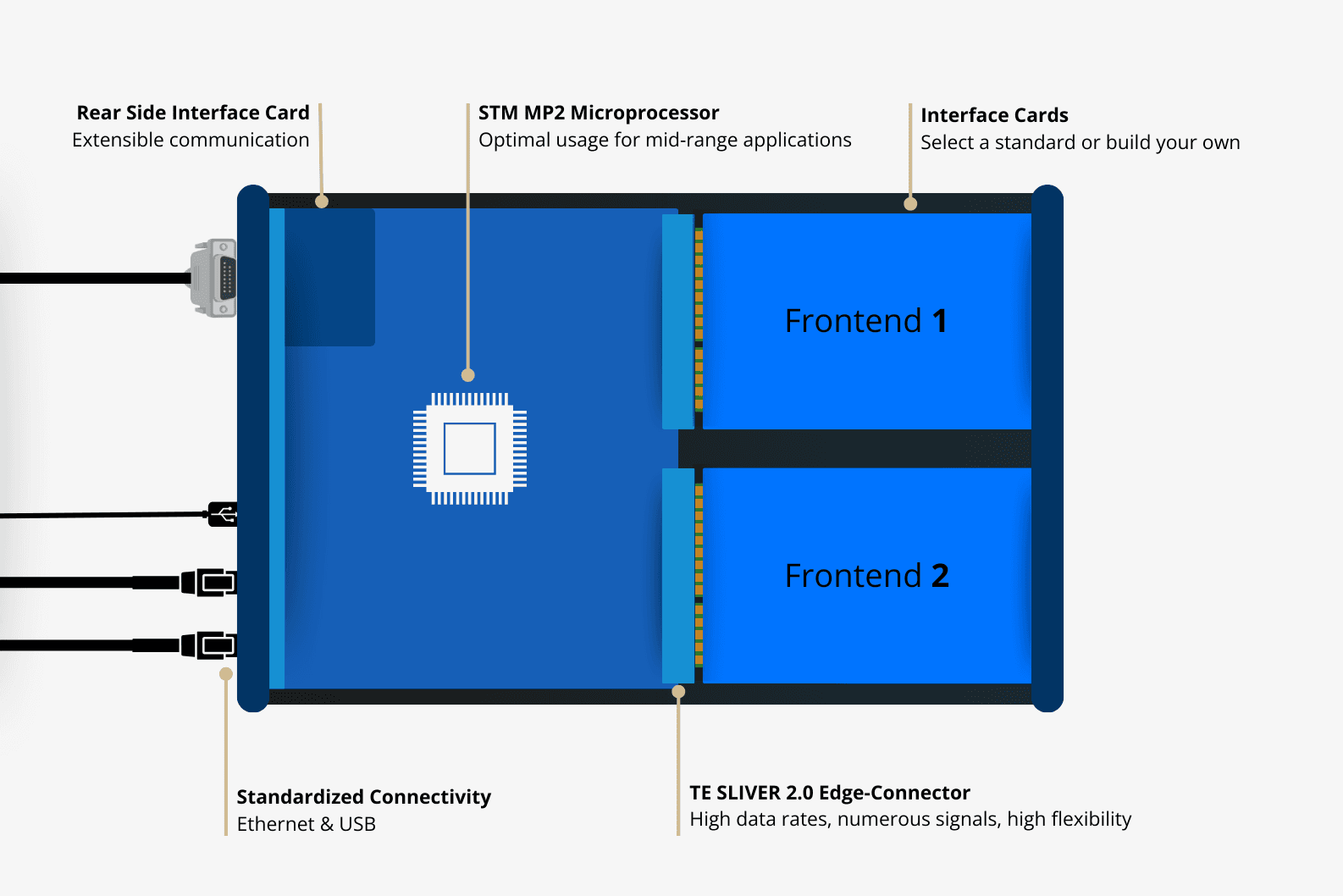 Capturing, processing, and streaming sensor signalsControlling actuators and power suppliesExecuting custom edge logicYou can use front ends and software from our ecosystem, integrate your own designs, or combine both.