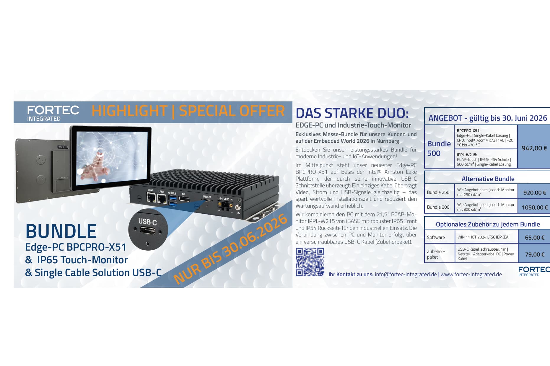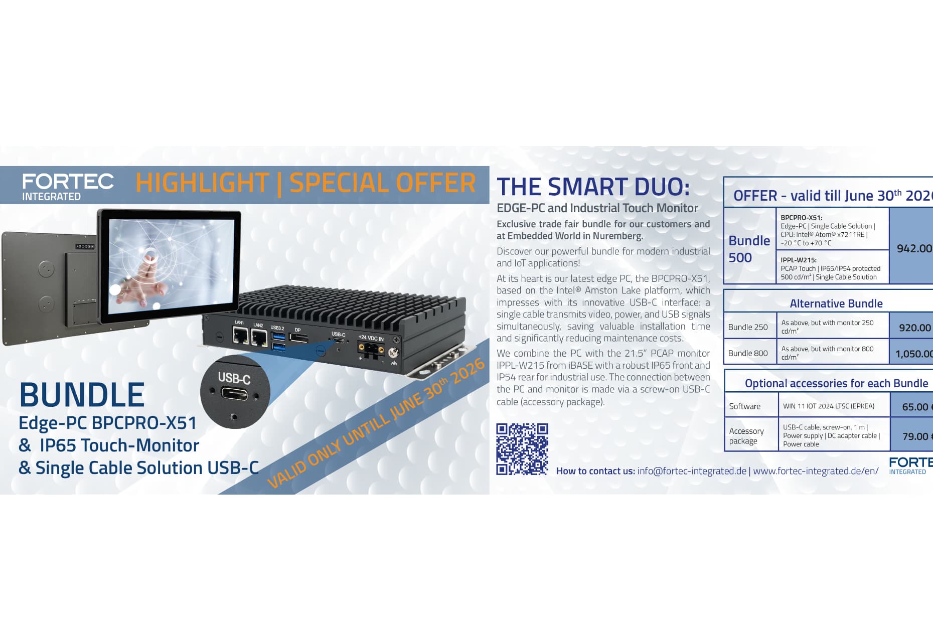We have a special trade fair offer for you at EW26: our BPCPRO-X51 bundled with the iPPL-215W, an industrial-grade 4K USB-C touch monitor, at a special trade fair price. We offer you the latest standards at an unbeatable price!