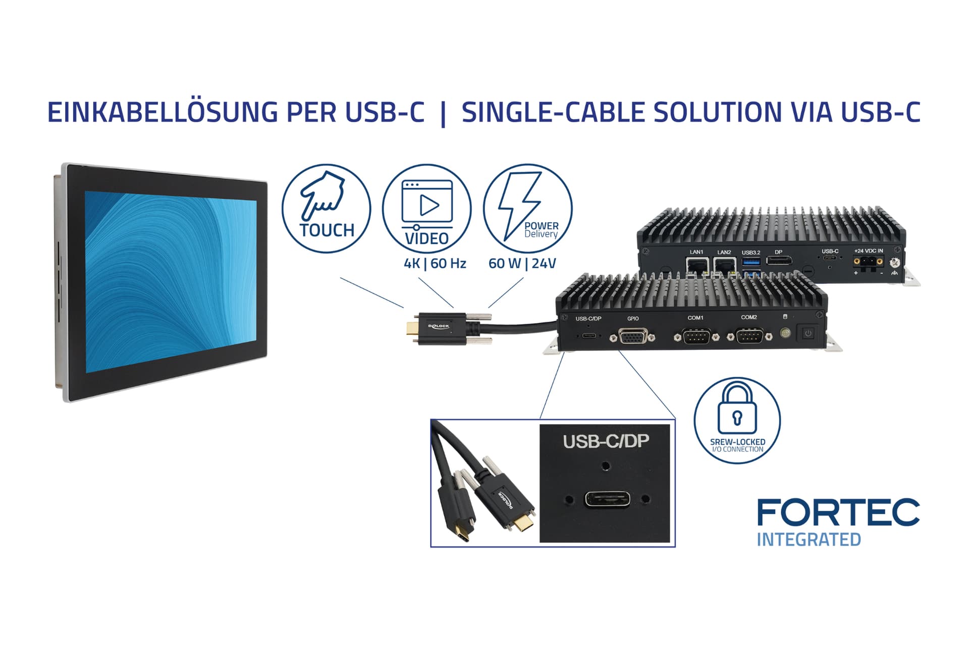 - Power, display, and touch signals are transmitted via a single USB-C cable