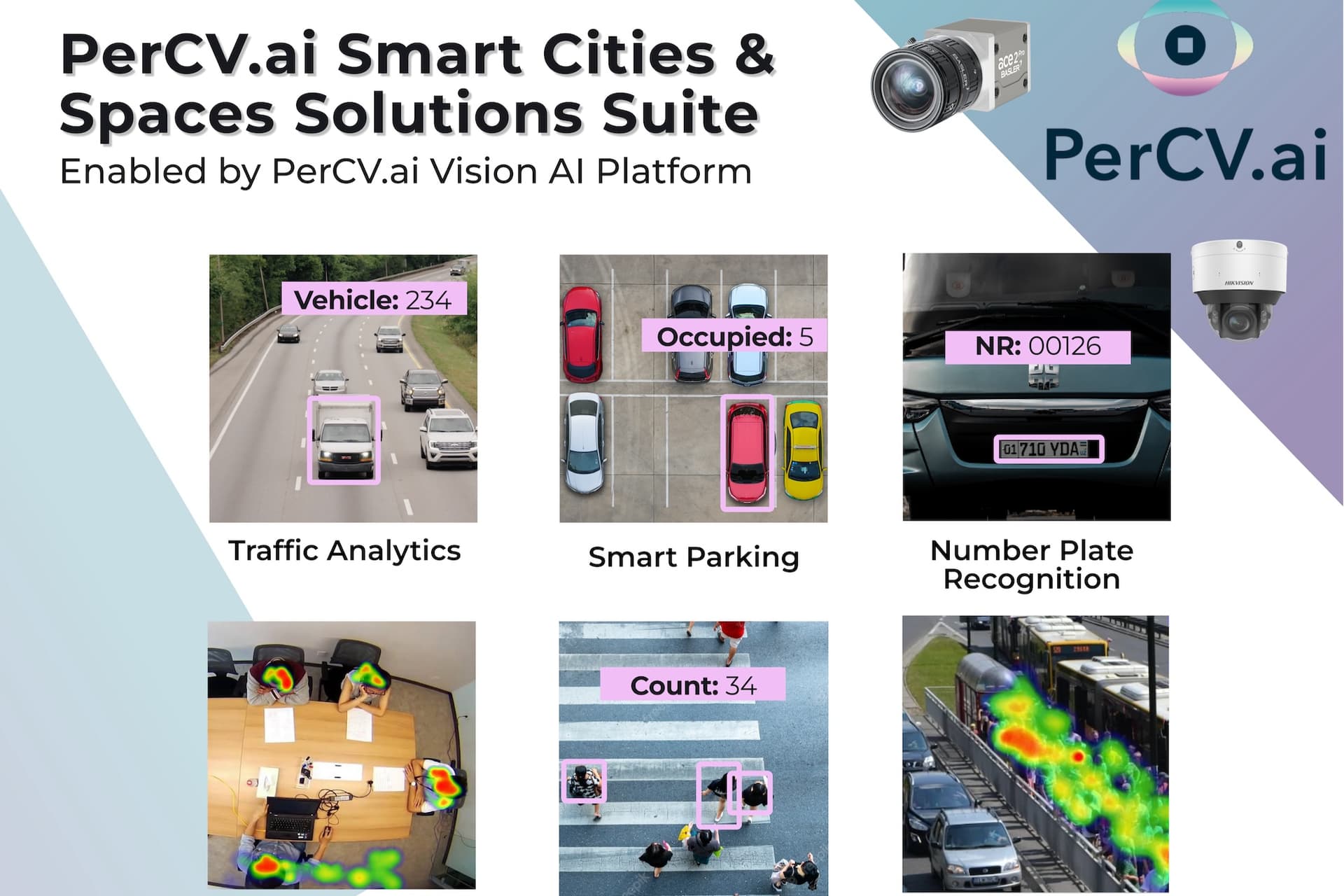 - Smart Cities & Spaces Suite: Revolutionizing Urban Living Becoming the "Eyes" of the Smart City Traffic Analytics People Counting & Heatmapping Free Flow Vehicle Number Plate Recognition Smart Parking Pedestrian Flow Monitoring Smart Bus Stops & Traffic Lights